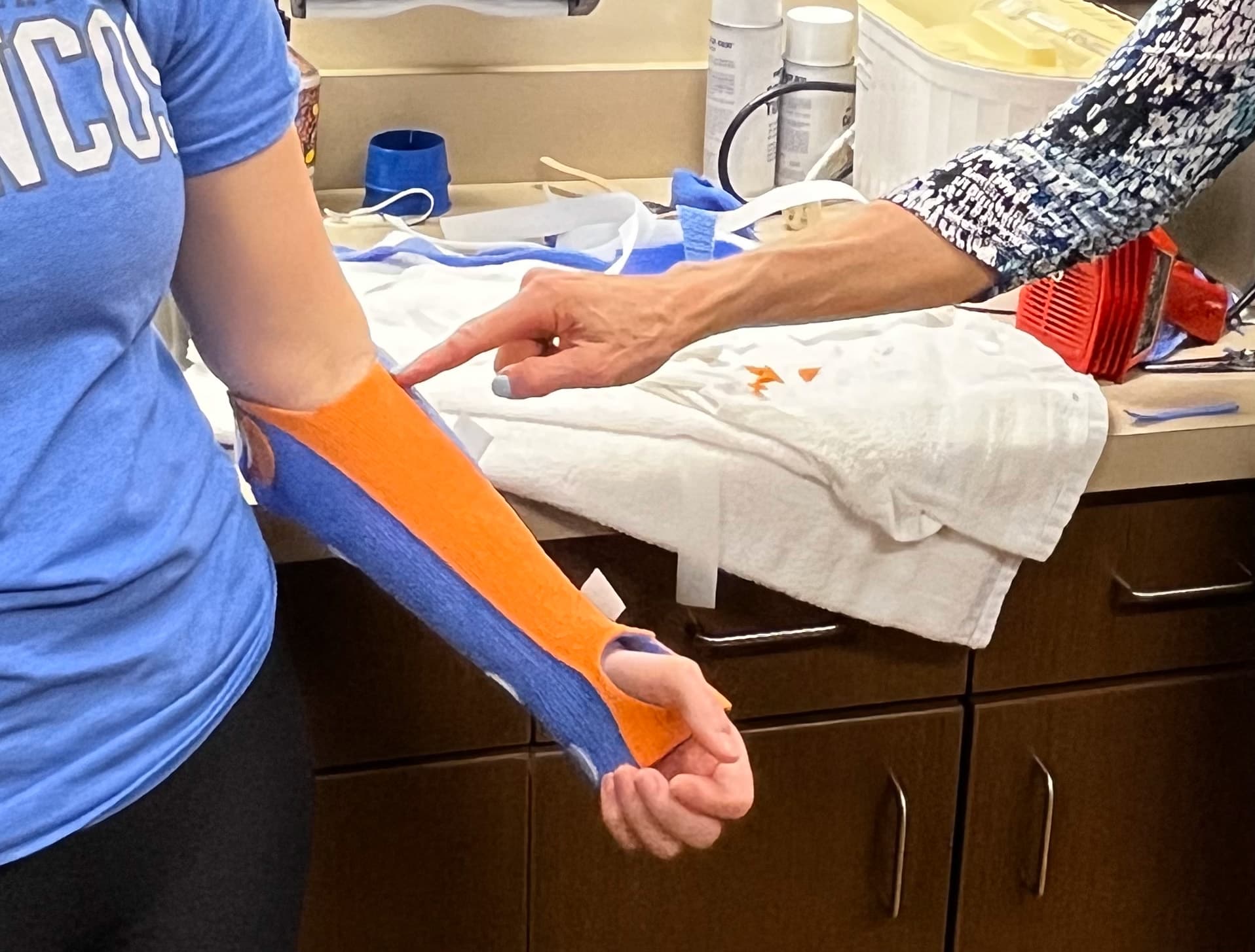 Thanks to the non-stick coating of the above thermoplastics, you can pinch the material together at the posterior elbow and on the ulnar border. Both hands are free to position the wrist in slight extension and the forearm in a neutral position.