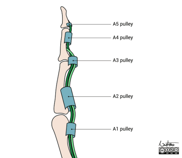 The pulley system is comprised of 5 annular and 3 cruciate pulleys situated on the volar aspect of the finger. Their role is to help maintain the position of the flexor tendons adjacent to the finger bones and prevent bow stringing of the tendons. The A2 pulley is situated on the volar aspect of the proximal phalanx. The full “crimp” position in rock climbing is when the pulp of the distal phalanges is loaded causing the distal interphalangeal (DIP) joints to hyperextend while the proximal interphalangeal (PIP) joints are flexed. In this posture, the flexor digitorum profundus (FDP) tendon is developing active tension while elongating, creasing an eccentrically loaded grip as the flexor digitorum profundus tendon (FDP) contracts across the DIP joint; this eccentric loading of the grip occurs as the DIP joints increase in hyperextension while maintaining the PIP position, lengthening the flexor tendons and increasing the bowstringing effect.